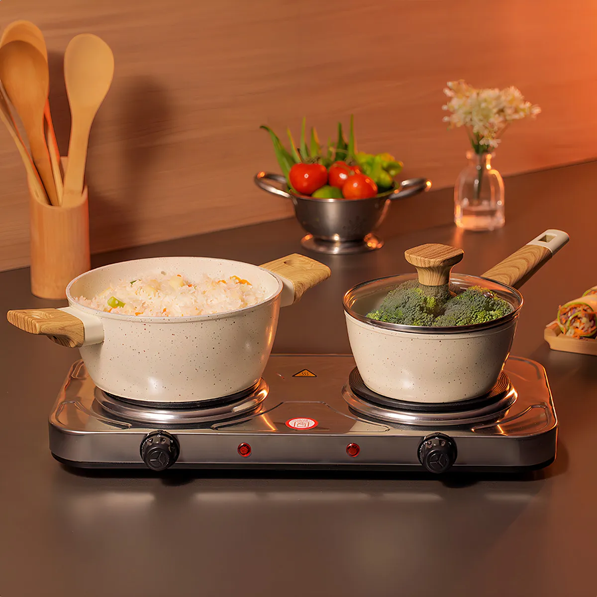 - Com acendimento automático e 2 queimadores.